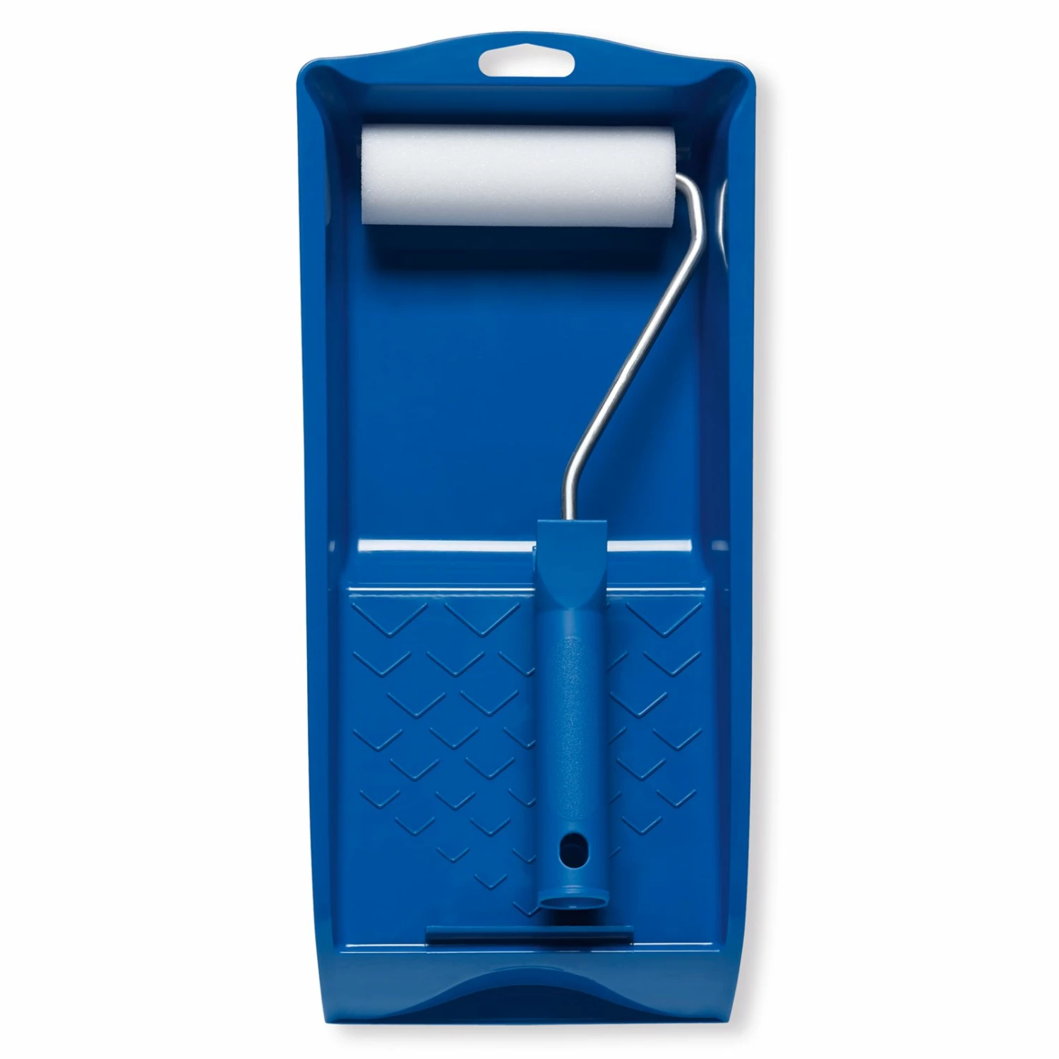 Das praktische Set beinhaltet eine Lackierwalze mit Bügel sowie eine Lackierwanne aus blauem Kunststoff.