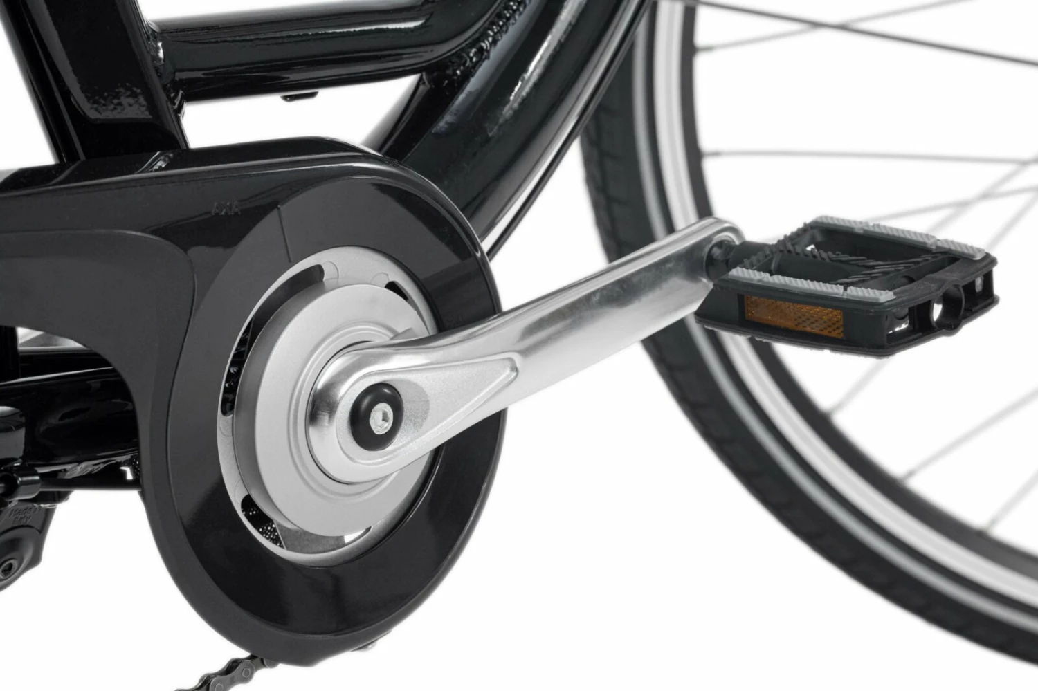 Das E-Bike mit dem tiefen Einstieg erfreut in klassischen Schwarz den Betrachter und ist ein leistungsstarker Begleiter auf Kurzdistanzen, aber auch auf längeren Strecken. Auch ohne Zuschalten des Elektromotors macht das dank des Aluminiumrahmens eher leichte Fahrrad Spaß. Mit sieben Gängen kommen Sie gut über Hügel oder Steigungen, die Federgabel gleicht Unebenheiten auf den Wegen aus und mit der kompletten Lichtausstattung vorne wie auch hinten ist das Fahren auch ohne Tageslicht sicher. Für noch mehr Spaß sorgt der Motor, der an der Vorderradgabel angebracht ist, und in fünf unterschiedlich starken Stufen beim Fahren unterstützen kann. Ganz einfach per Knopfdruck über das am Lenker angebrachte Display entscheiden Sie, ob bzw. wieviel „elektrischen Rückenwind“ Sie gerne hätten. Die Kapazität des hochwertigen Lithium-Ionen-Akkus reicht für bis zu 80 km Reichweite. Innerhalb von etwa sieben Stunden ist der Akku wieder geladen.