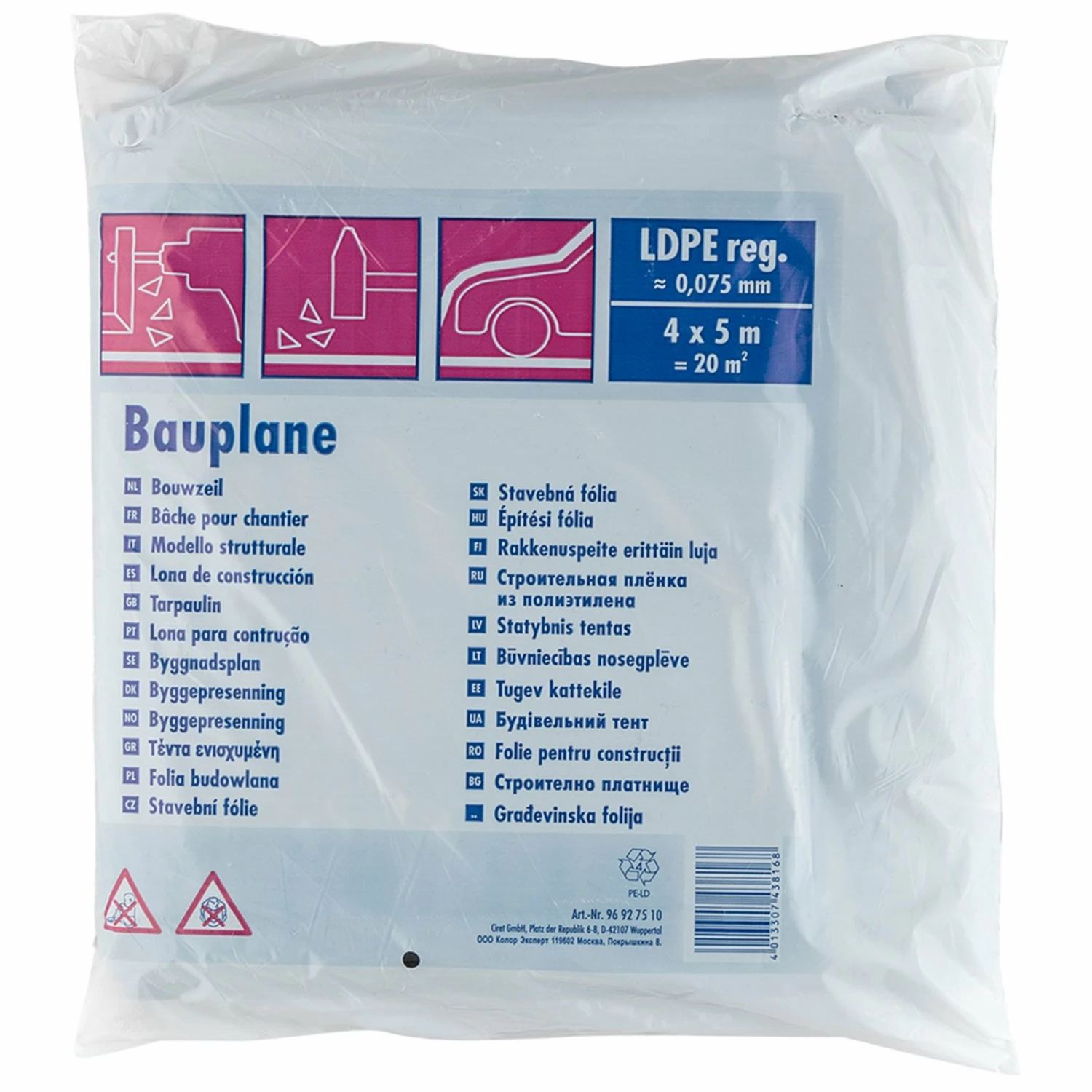 Diese transparente Bauplane ist für eine Gesamtfläche von etwa 20 m² ausgelegt. Sie schützt bei Bauarbeiten sowie bei Tapezier- und Streicharbeiten.