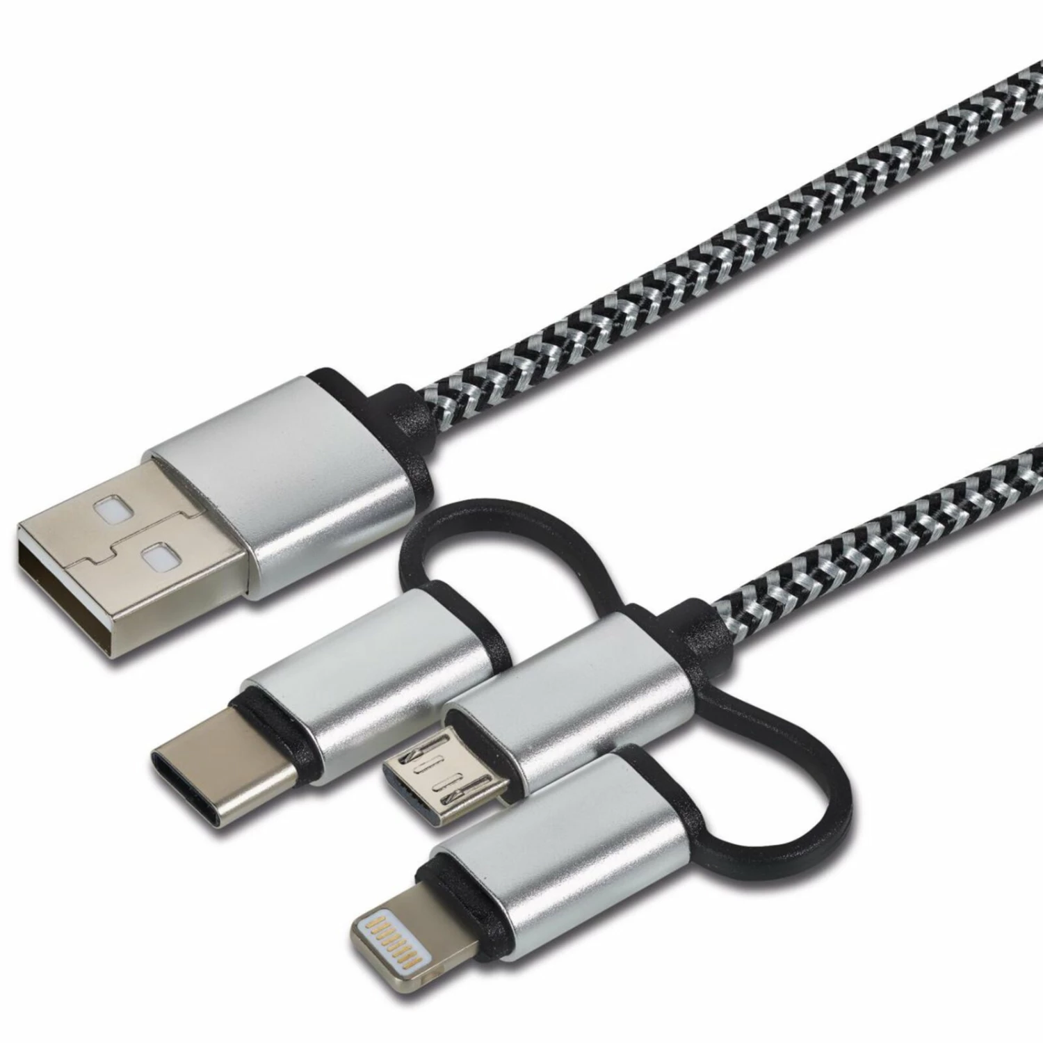 USB Daten- und Ladekabel für alle gängigen mobilen Geräte. Das Kabel ist zusätzlich durch eine Ummantelung geschützt.