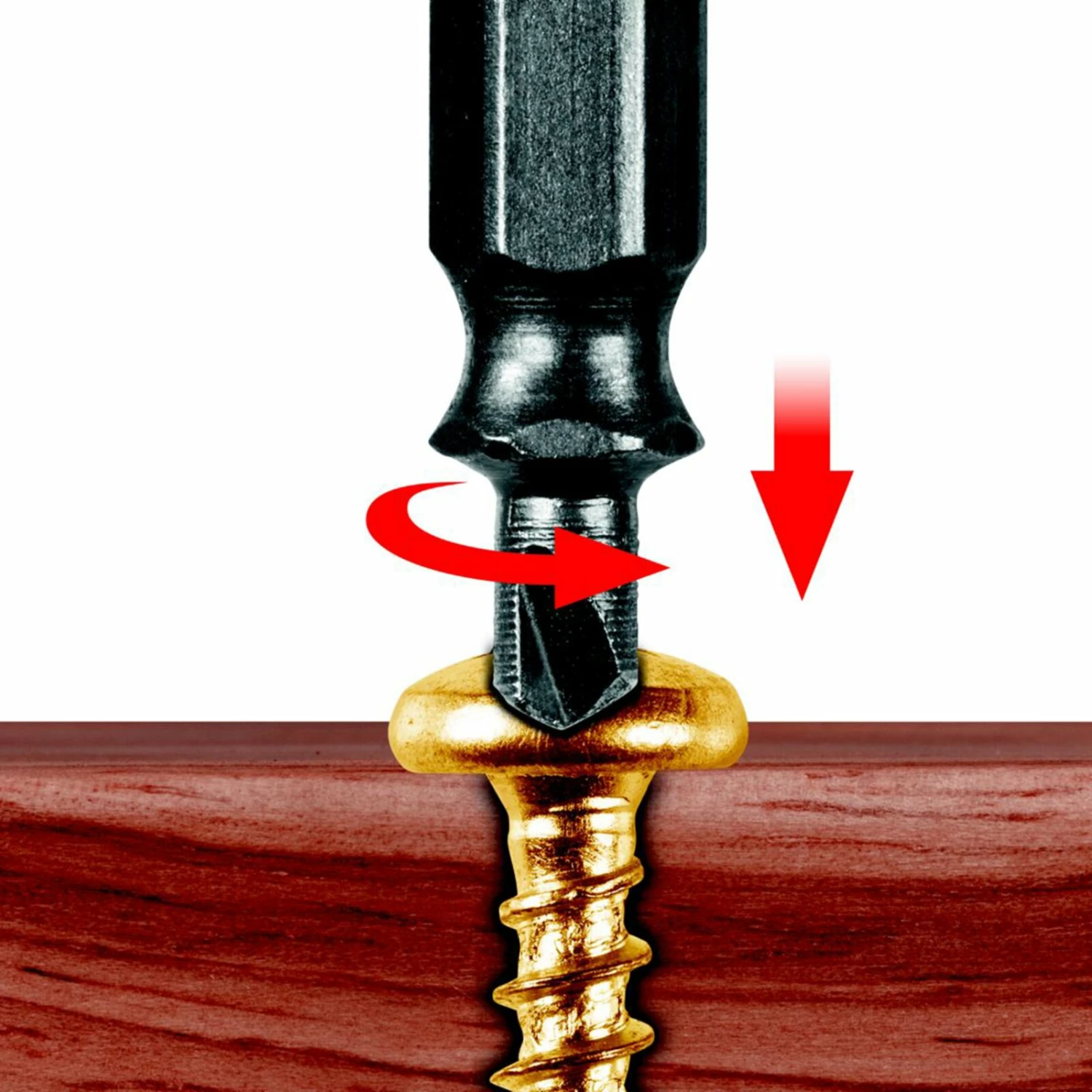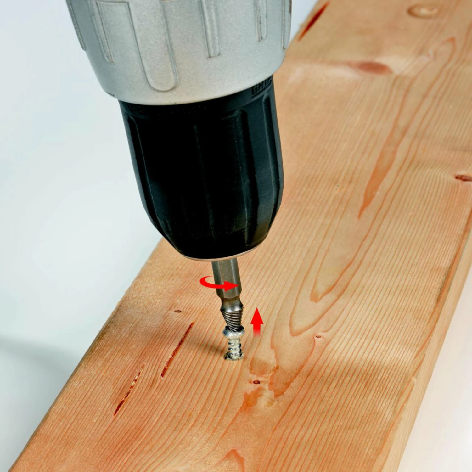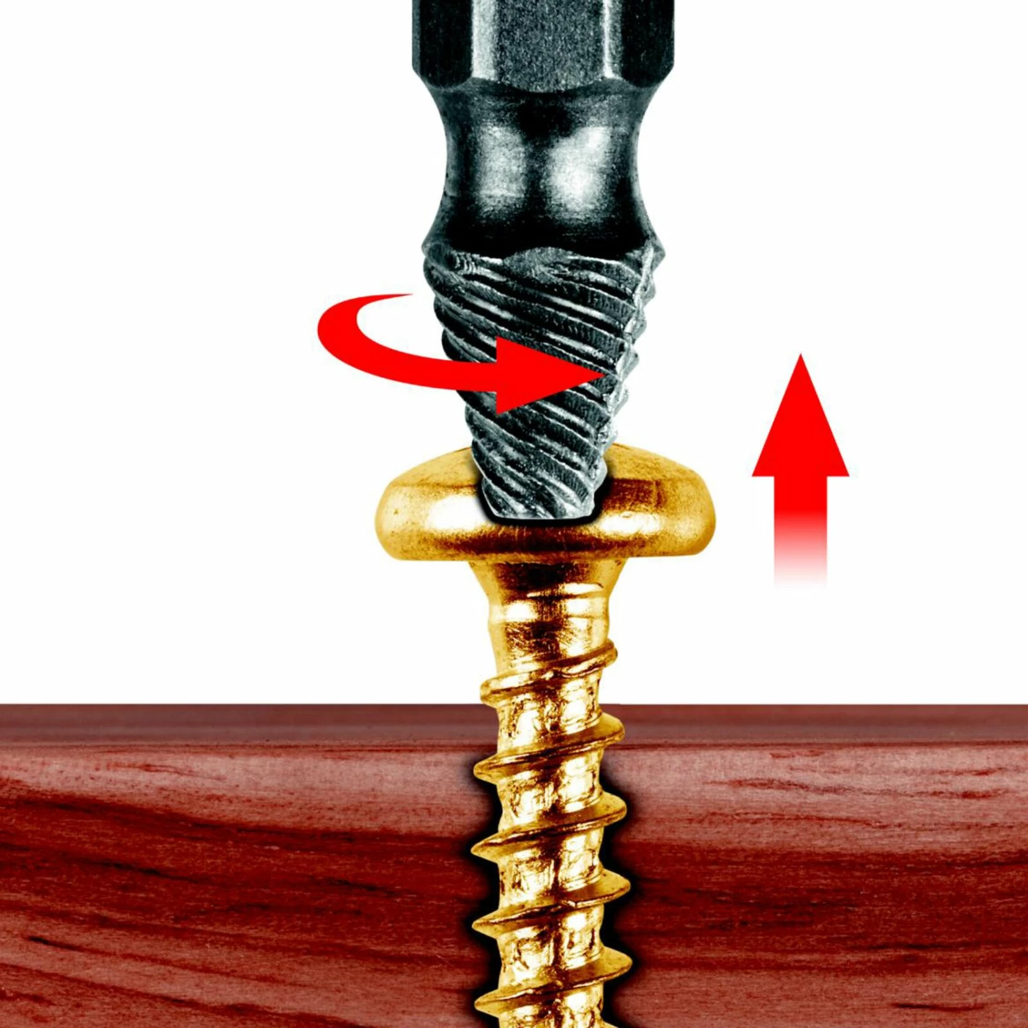 Ärgern Sie sich nicht mehr über Schrauben mit kaputten oder überdrehten Köpfen, die Sie nicht mehr entfernen können. Die vier verschiedenen Bits des Schrauben-Entferner-Sets haben jeweils zwei Seiten (einmal zum Bohren und einmal zum Rausdrehen). Einfach in eine handelsübliche Bohrmaschine einspannen und los gehts: Stellen Sie die Bohrmaschine auf die niedrigste Geschwindigkeitsstufe und bohren Sie mit der Bohrerseite des Bits gegen den Uhrzeigersinn ein Loch in die Schraube. Entnehmen Sie den Bit und setzen ihn mit der Ausdreherseite nach außen wieder ein. Nutzen Sie nun die Seite langsam gegen den Uhrzeigersinn, um die Schraube zu entfernen, während Sie sanften Vorwärtsdruck anwenden.
