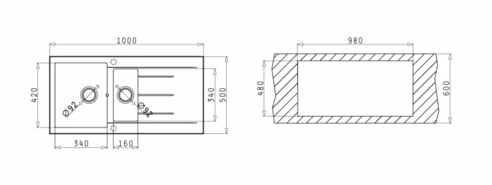 Pyragranite-Einbauspüle ALAZIA mit kleinen Eckradien, Restebecken und moderner Abtropffläche für Unterschränke ab einer Breite von ca. 60 cm.