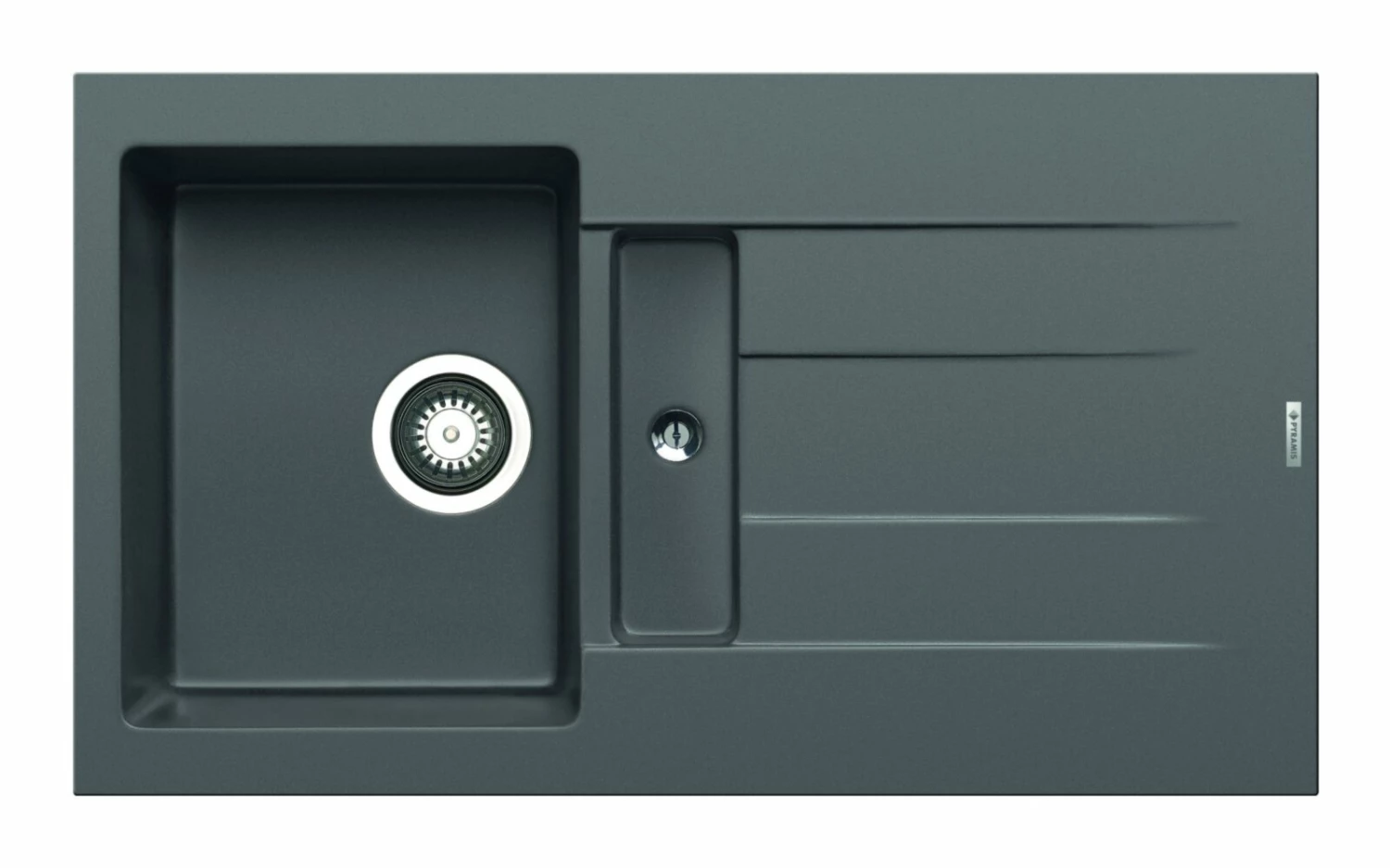 Attraktive Einbauspüle ATHLOS im stilvollen Grau mit einem Becken, einem kleinen Restebecken und eine Abtropffläche aus Granit. Diese Einbauspüle eignet sich für Unterschrankbreite ab 50 cm.