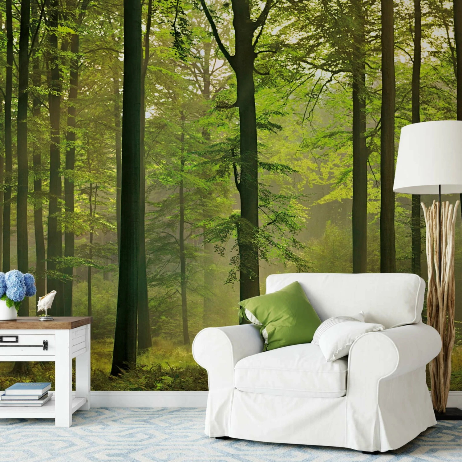 Diese stilvolle Wald Fototapete in der Farbe Grün sorgt für ein angenehmes Wohnambiente in Ihrem Zuhause. Das Trägermaterial dieser Fototapete ist ein Vlies. Sie hat die Maße 3,84 Meter x 2,6 Meter und ist waschbeständig, gut lichtbeständig und restlos trocken abziehbar.
