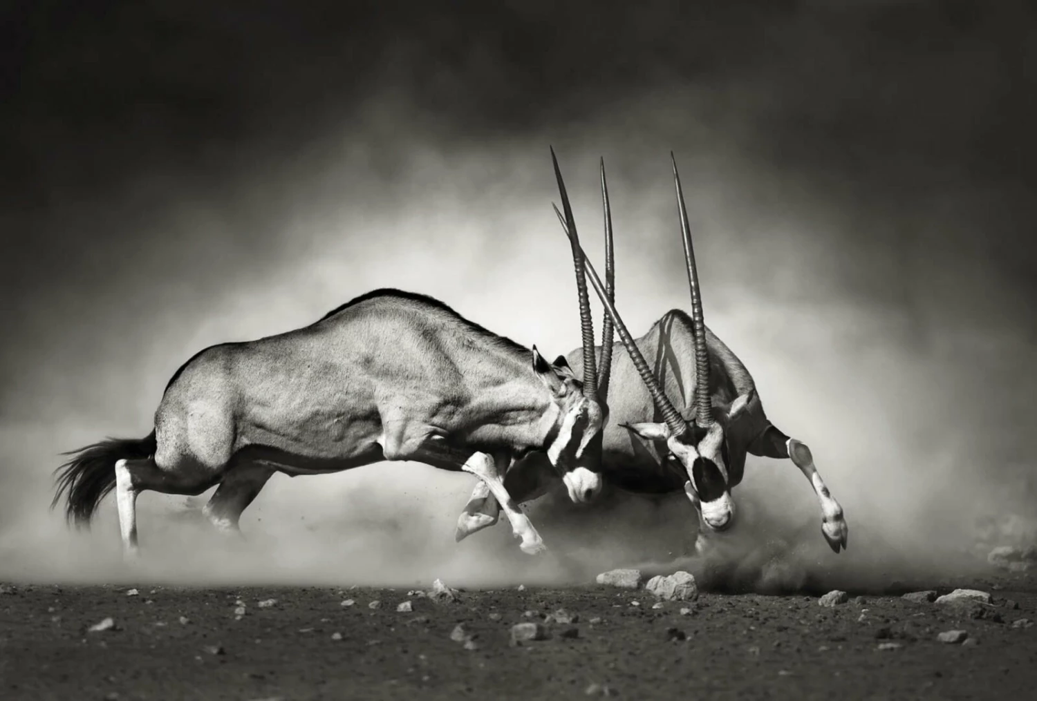 Fototapete DESIGNWALLS 2.0 – schwarz-weiß – Duell – 2,6 Meter