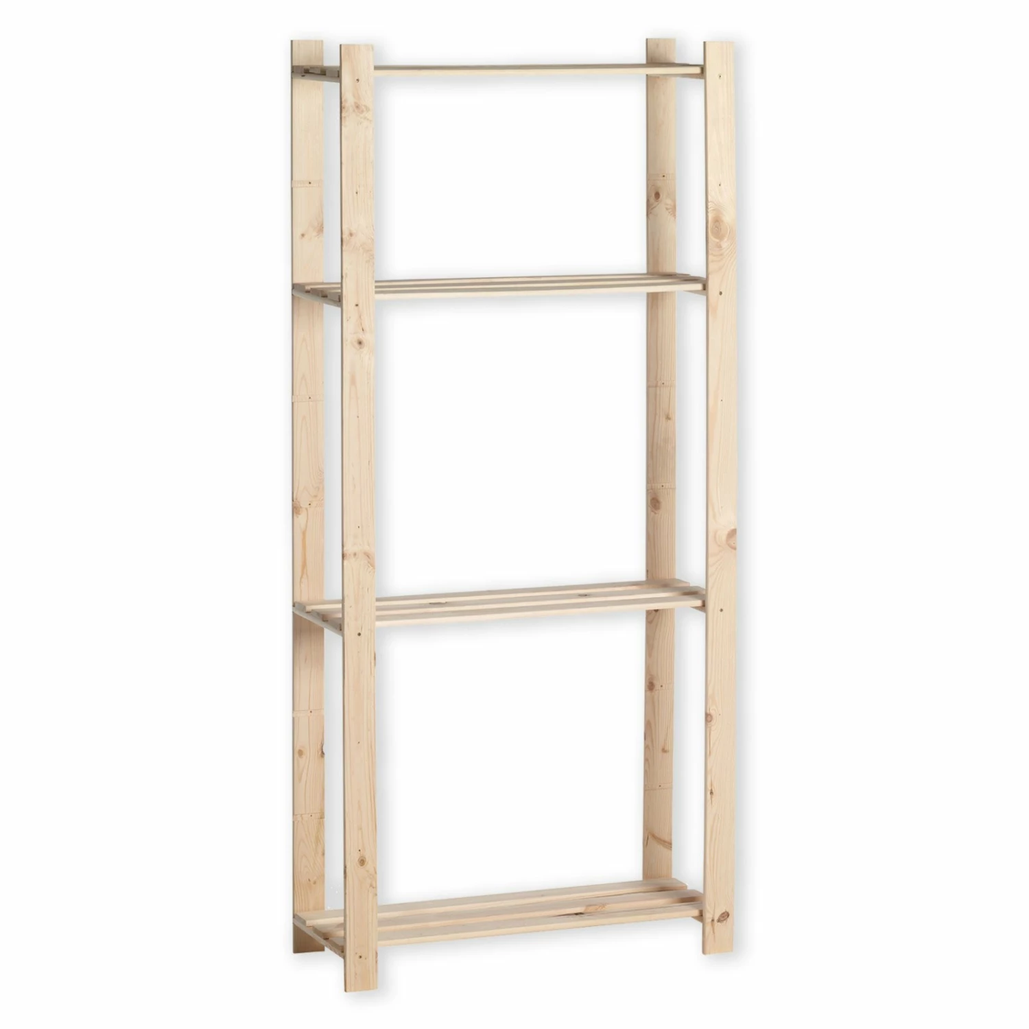 Das Holzregal lässt sich vielseitig einsetzen. Ob im Hauswirtschaftsraum oder der Küche. In der Garage oder im Heimwerker-Keller. Jeder der vier Böden ist mit etwa 40 kg belastbar.
