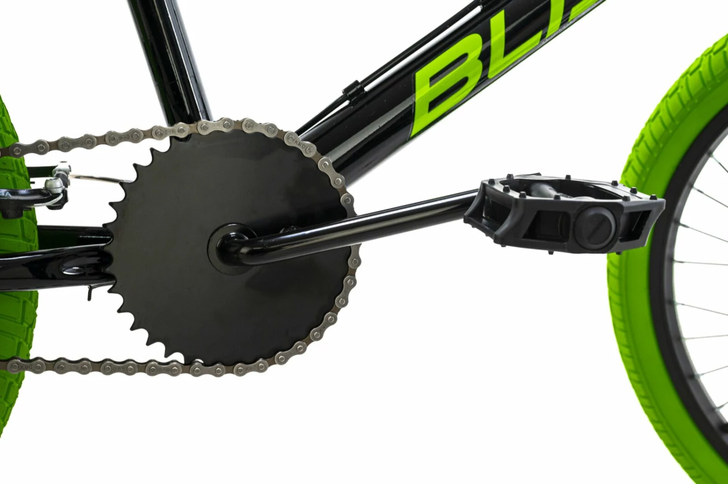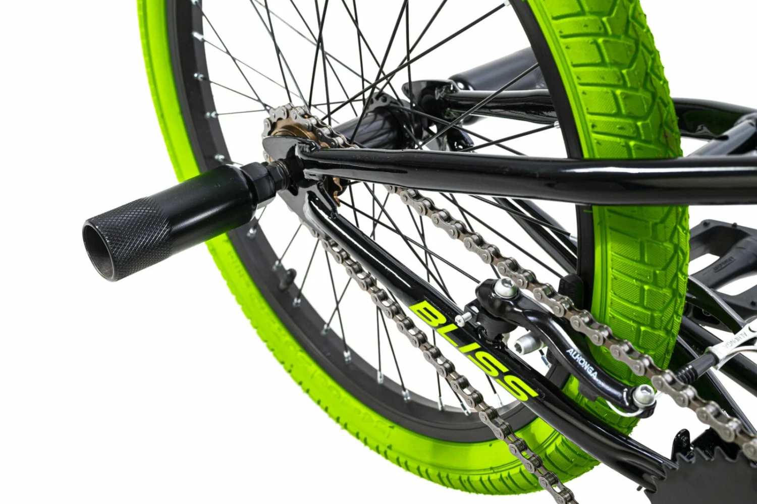 Mit dem schwarz-grünen BMX-Bike Freestyle BLISS können coole Tricks erlernt und ausgeübt werden. Das 20 Zoll BMX-Rad ist am zweiteiligen Stahllenker mit einem 360° Rotorsystem ausgestattet, das Drehungen um die eigene Achse ermöglicht und die Stahlpegs sind im Lieferumfang mit inbegriffen und sind eine optimale Unterstützung für eindrucksvolle BMX Stunts.