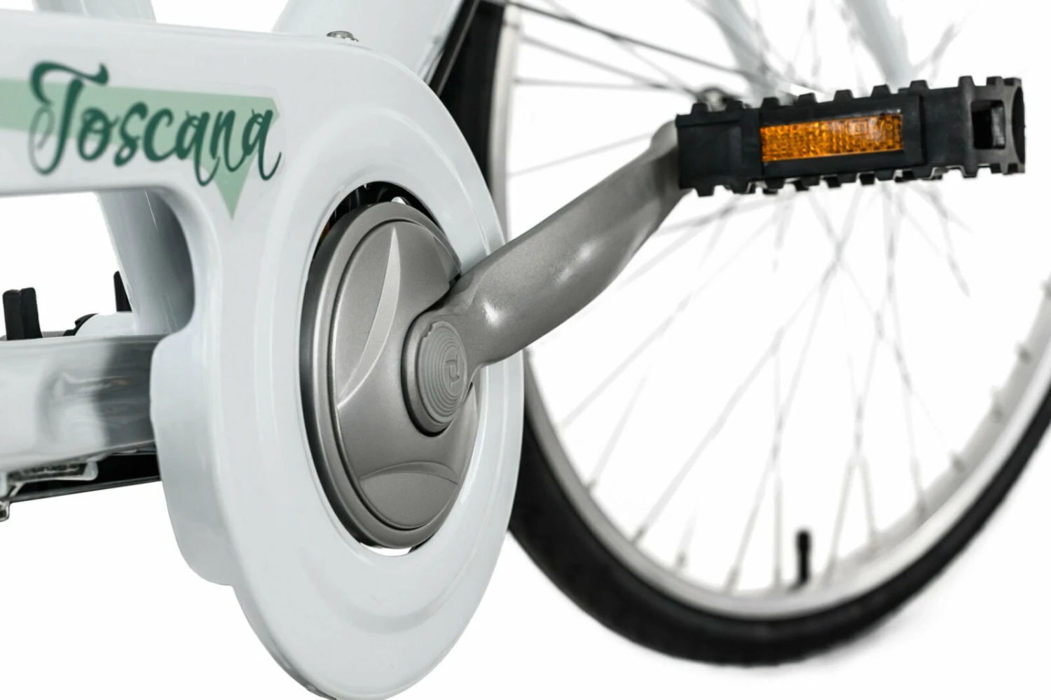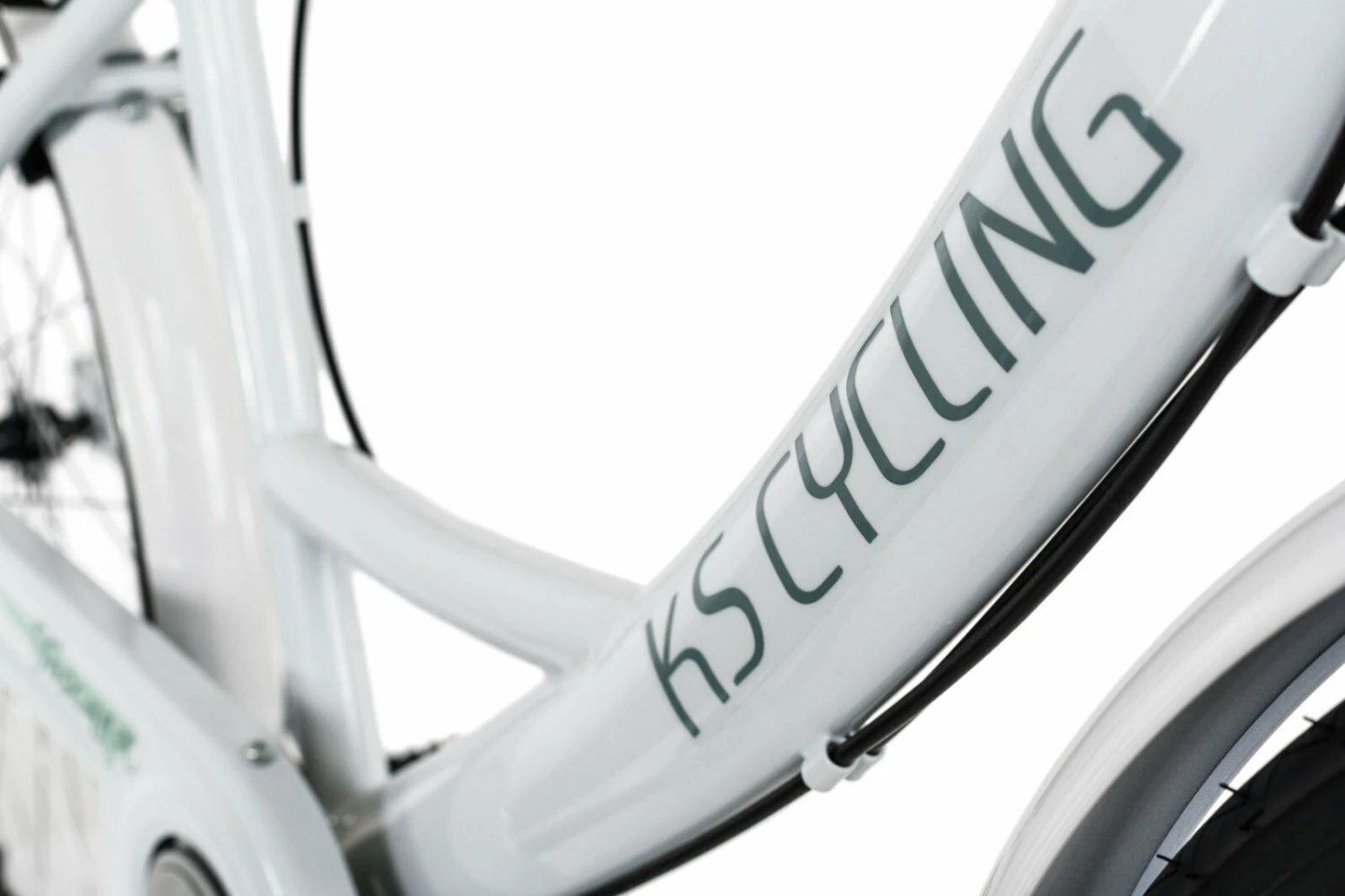 Das KS Cycling Damenfahrrad Toscana 26“ verfügt über einen Hi-Ten Stahlrahmen und eine Rahmenhöhe von etwa 41 Zentimetern und ist mit Aluminium V-Brake-Bremsen vorne und hinten ausgestattet. Der Widerstand kann mit der 6-Gang SHIMANO Schaltung bestimmt und der Steigung angepasst werden. Zudem verfügt das Rad über einen Halogenscheinwerfer vorn und über ein Dioden-Rücklicht. Jedoch kann dieses Damen-City-Rad nicht nur mit der Ausstattung überzeugen, sondern auch mit der zeitlosen und stilvollen Optik in schickem Weiß.