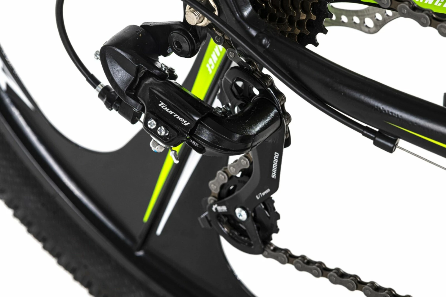 Das 29″ Mountainbike in Schwarz mit grünen Akzenten wird zum absoluten Hingucker! Das Bike ist mit einer 21-Gang-Schaltung ausgestattet. So findest du immer die richtige Gangeinstellung, egal ob du zügig abwärts oder bergauf fahren willst. Die mechanischen Wave-Scheibenbremsen sorgen hierbei für die Sicherheit. Das Mountainbike steht nicht nur dank der Hammer-Optik im Mittelpunkt, sondern die 29 Zoll-Magnesium-Aluminum-Laufräder mit gedichteten Rillenkugellagern sind hier das absolute Highlight.
