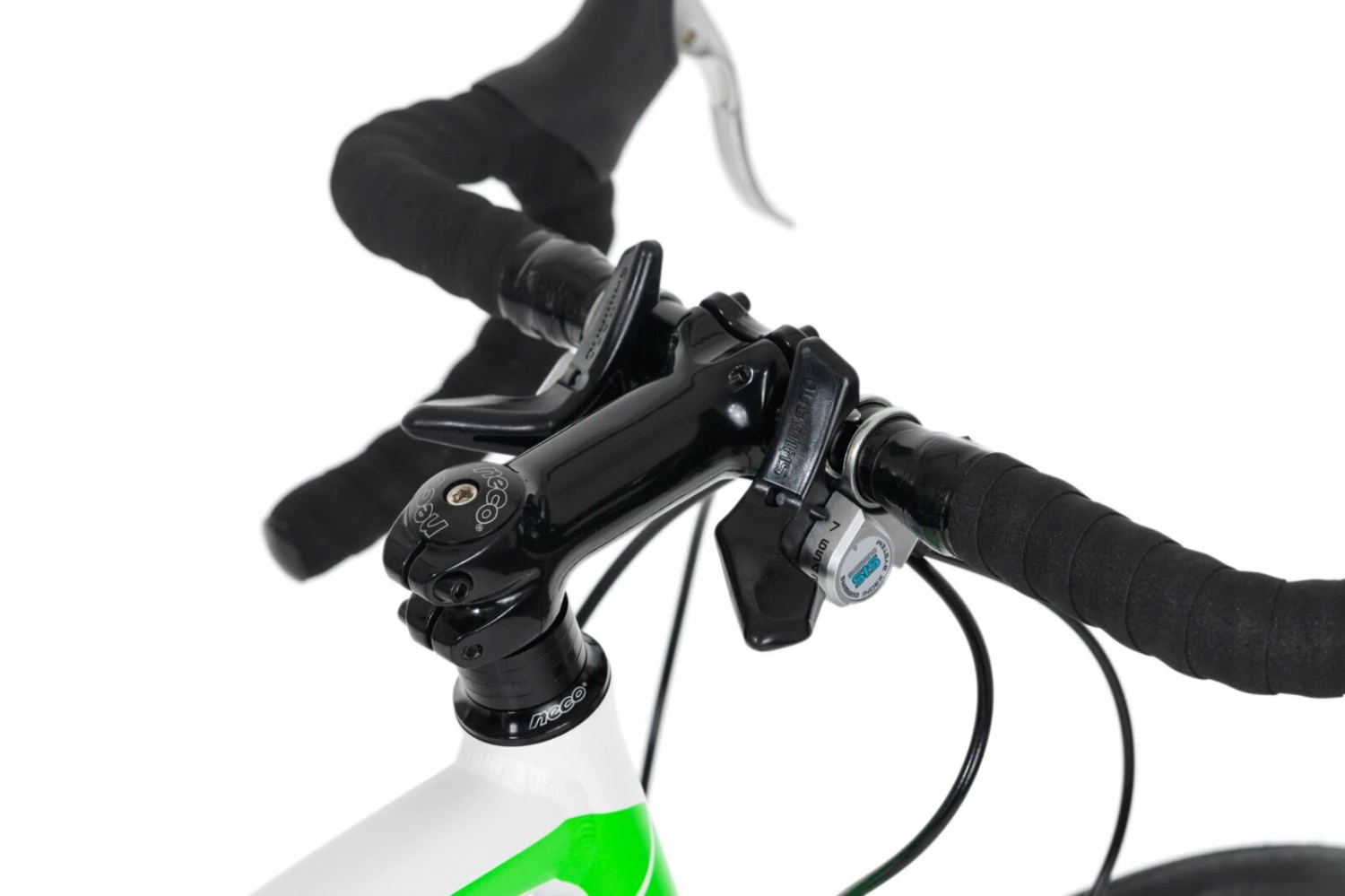 Mit diesem Rennrad ist dein Weg zur persönlichen Bestleistung frei! Das weiße Rad mit grünen Akzenten und dem geschwungenen Oberrohr wird zum absoluten Hingucker. Bei dem Rahmen handelt es sich um einen Aluminium-Rahmen mit auswechselbarem Schaltauge. Mit den Aluminium-Seitenzug-Rennbremsen kannst du sicher deine Geschwindigkeit regulieren. Eine 14-Gang SHIMANO-Schaltung unterstützst dich auf den verschiedensten Steigungen. Die Pedale sind bereits mit Haken und Riemen ausgestattet.