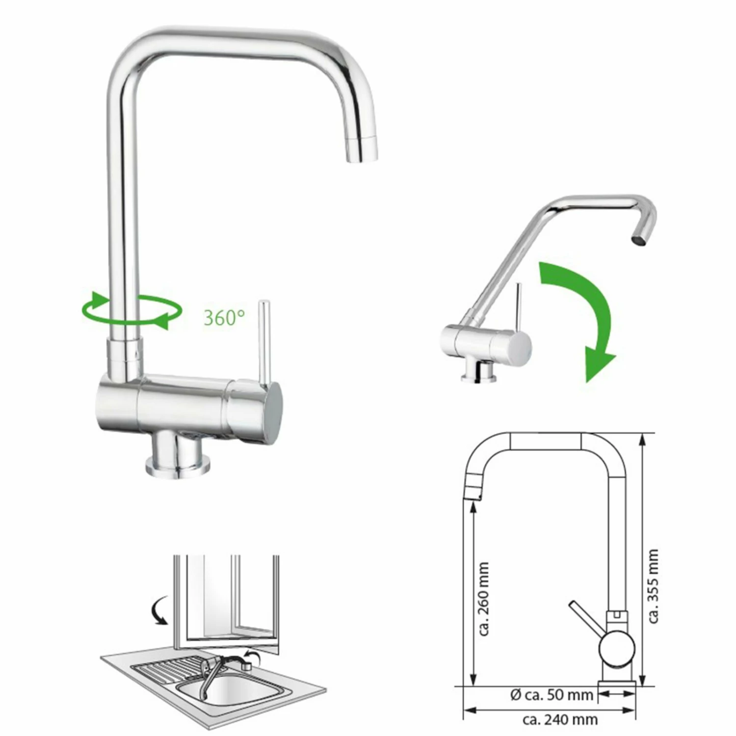 Die um 360° drehbare Küchenarmatur fügt sich nahtlos durch das edle Chrom-Design in Ihre Küche ein. Durch die Möglichkeit diese Armatur umzuklappen, lässt diese sich auch beispielsweise problemlos unter einem Fenster montieren. Dank Kaltwasserstart ist diese Küchenarmatur besonders wasser- und energiesparend.