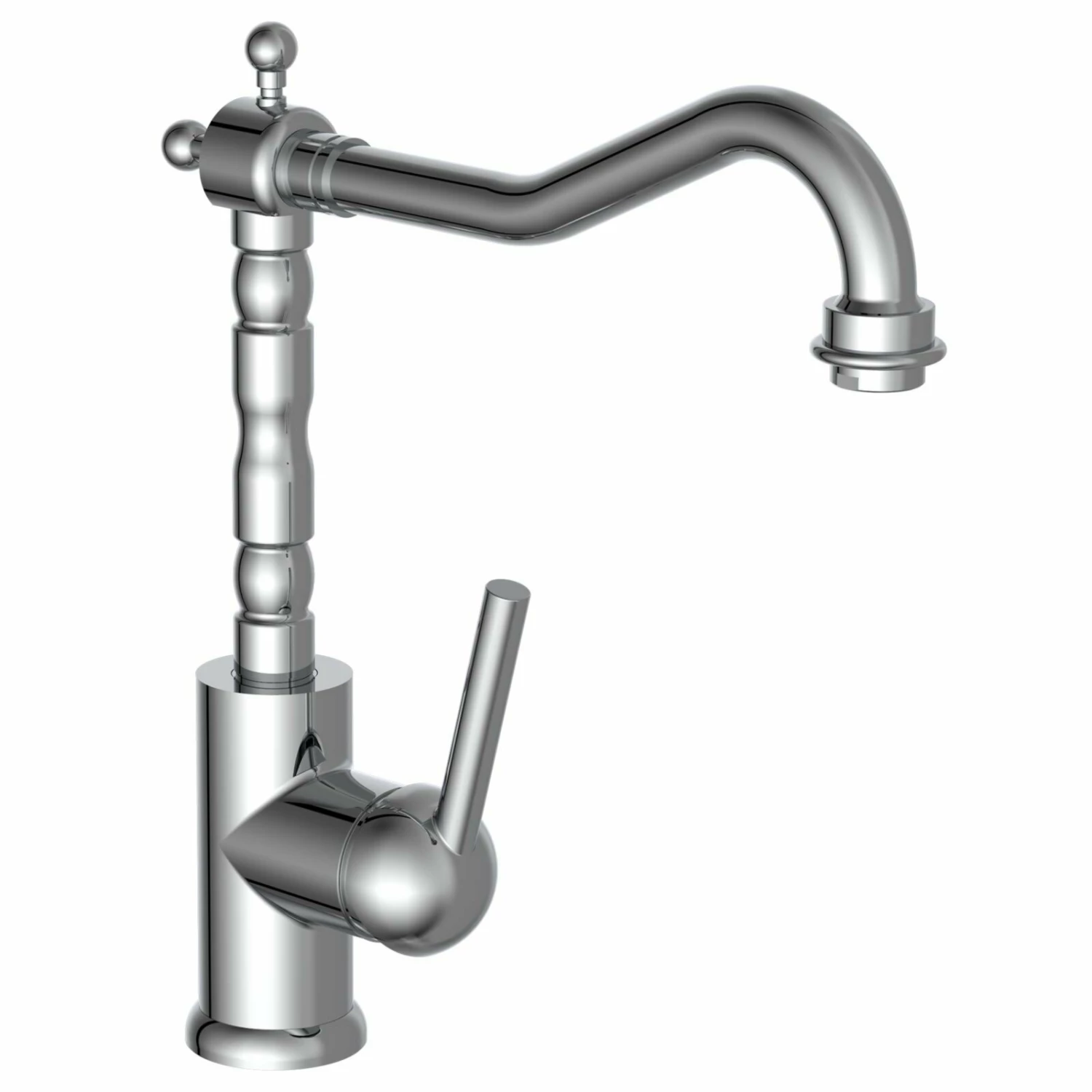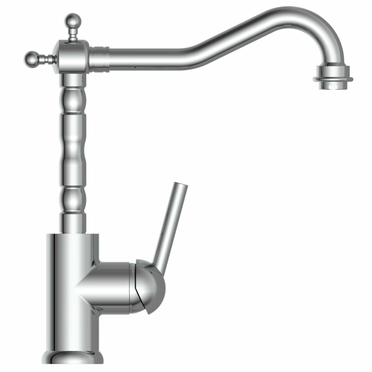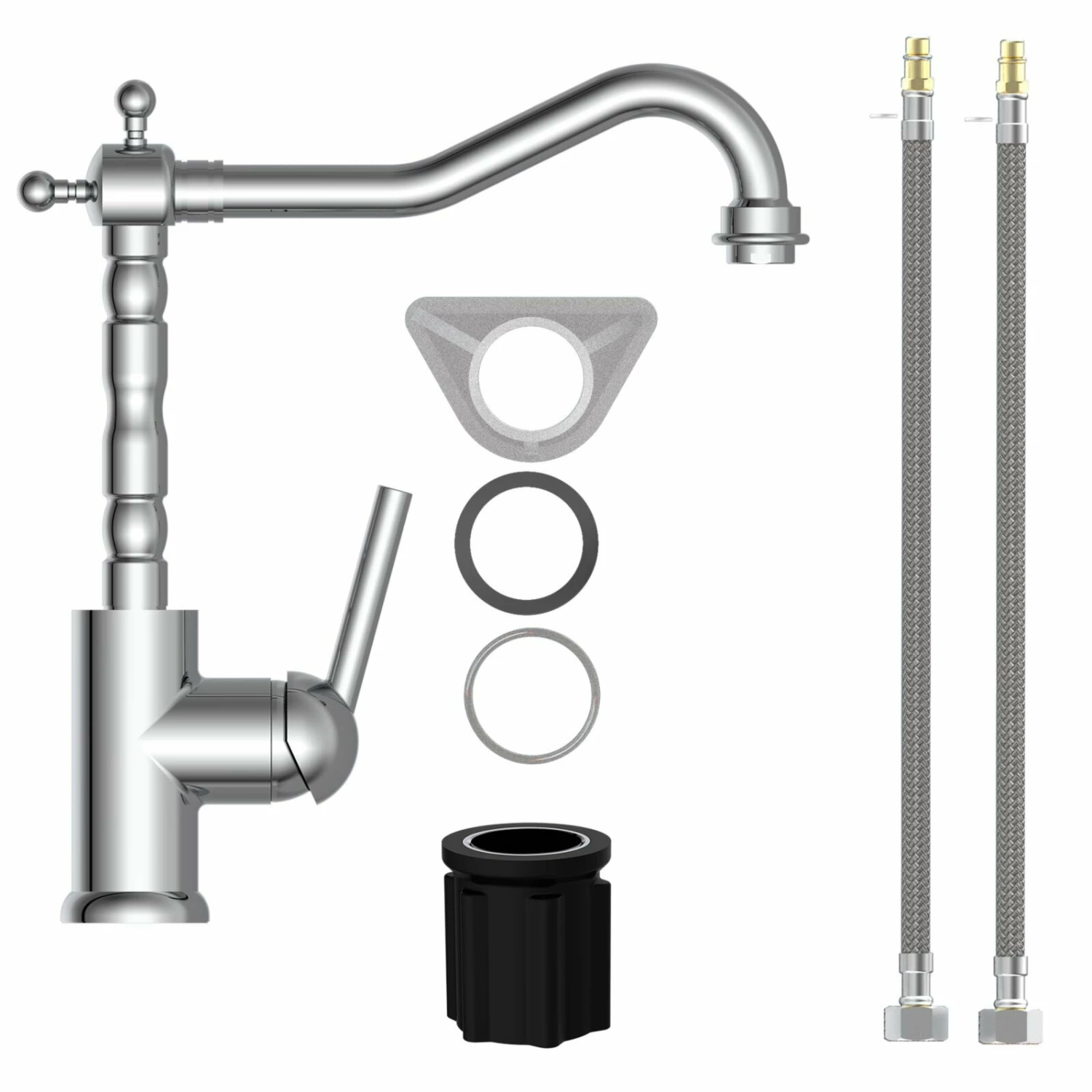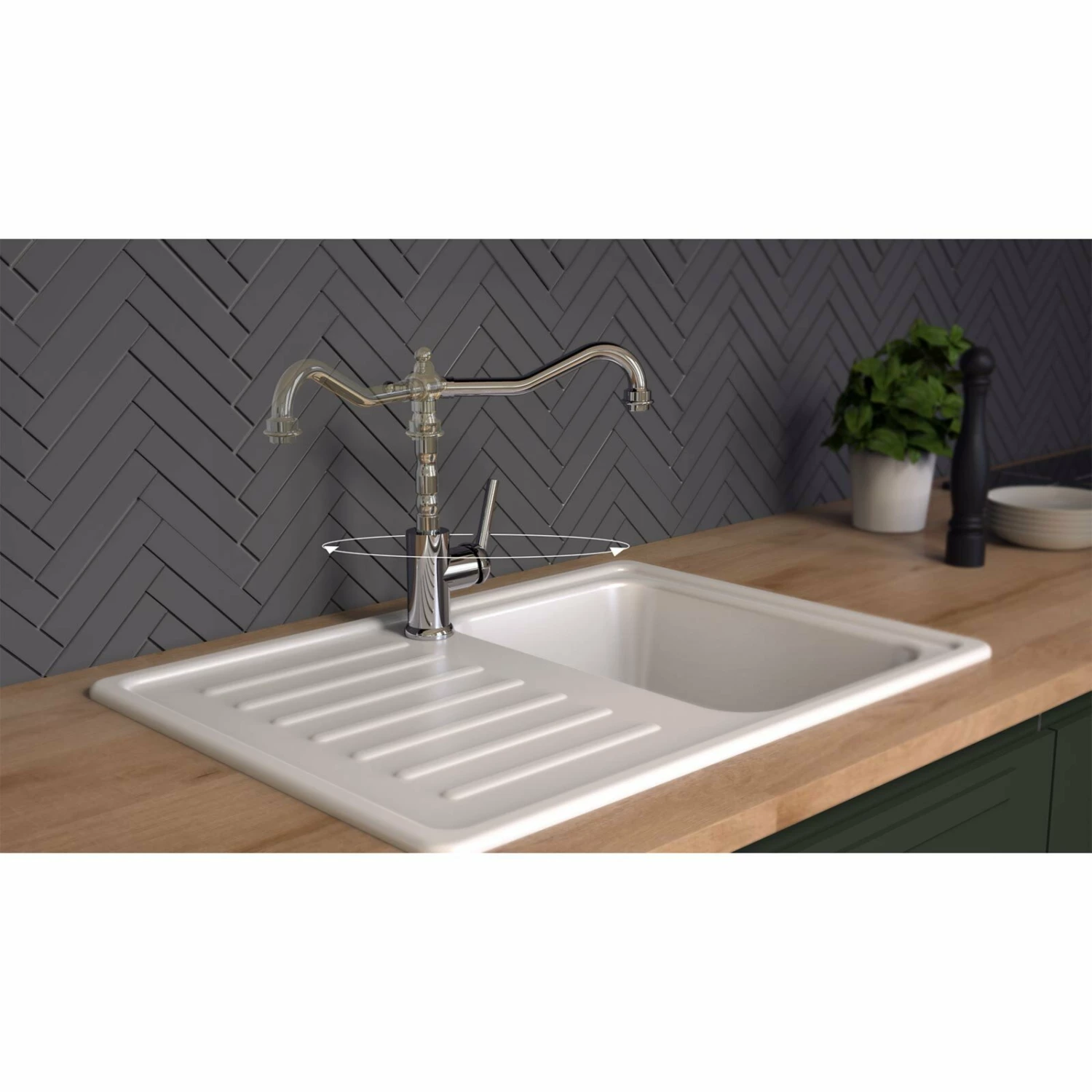 Stylische Hochdruck-Küchenarmatur im Landhausstil. Durch ihren romantischen Stil fügt sie sich wunderbar in jede Küche – sowohl in Landhaus-Küchen als auch in moderne Küchenzeilen. Die Armatur besteht aus Messing und verfügt über eine Chrom-Optik. Geräuscharm und pflegeleicht ist sie obendrein. Der schwenkbare Auslauf steht für Flexibilität und erleichtert so das Säubern und Spülen.