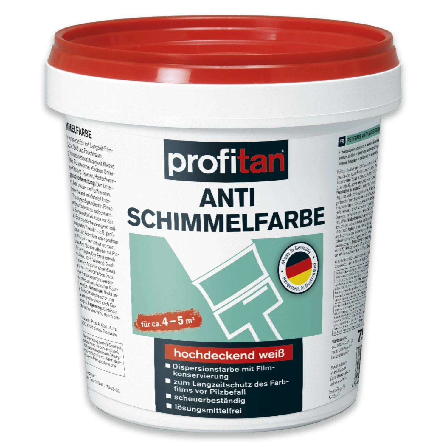 Die profitan Anti-Schimmelfarbe ist mit ihrem hochdeckendem Weiß sehr effektiv. Der Inhalt von etwa 750 ml ist ausreichend für eine Fläche von etwa 4-5 m². Es handelt sich hierbei um eine Dispersionsfarbe mit Fimlkonservierung und dient damit dem Langzeitschutz vor Pilzbefall. Die Anti-Schimmelfarbe ist scheuerbeständig und lösungsmittelfrei.