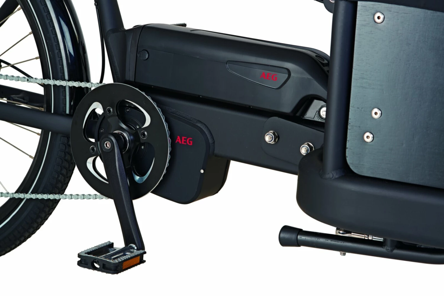 Das Lastenrad von PROPHETE ist ein Platzwunder. Etwa 73 Liter Volumen bietet die großzügige Transportbox am Vorderrad. Hier transportieren Sie sicher auch größere Einkäufe wie Getränkekisten etc. Mithilfe des 250-Watt-AEG-Motors können Sie auch ohne allzu große Anstrengung fahren. Der am Unterrohr angebrachte Akku sorgt für eine Reichweite von über 100 km, und ist auch schnell wieder aufgeladen: In rund vier bis sechs Stunden ist der Akku wieder auf 100% Kapazität. Dank der Beleuchtung am Vorder- sowie Hinterrad sowie der hydraulischen Bremse, sind Sie sicher unterwegs.