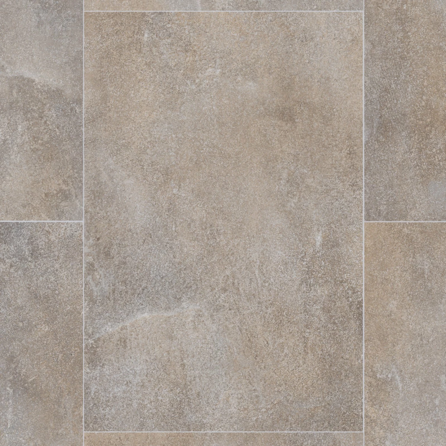 Moderner PVC-Bodenbelag in grau- und beigefarbener Steinplattenoptik. Lassen Sie sich diesen Boden in Ihrem nächstgelegen ROLLER-Markt auf die passende Länge zuschneiden, sofern vorhanden.