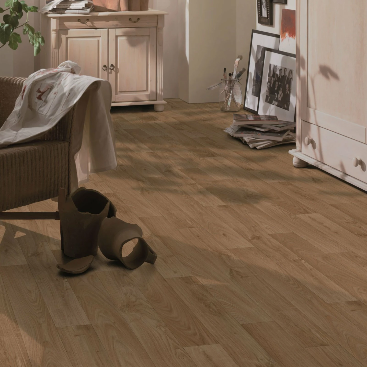 Dieser braune PVC-Bodenbelag in Plankenoptik verschönert jeden Wohnraum. Er wirkt natürlich und trägt zu einer gemütlichen Atmosphäre bei. Der Belag ist pflegeleicht und für eine Nutzung mit Fußbodenheizung geeignet. Kommen Sie in unsere Filiale und lassen Sie sich die richtige Länge zuschneiden.