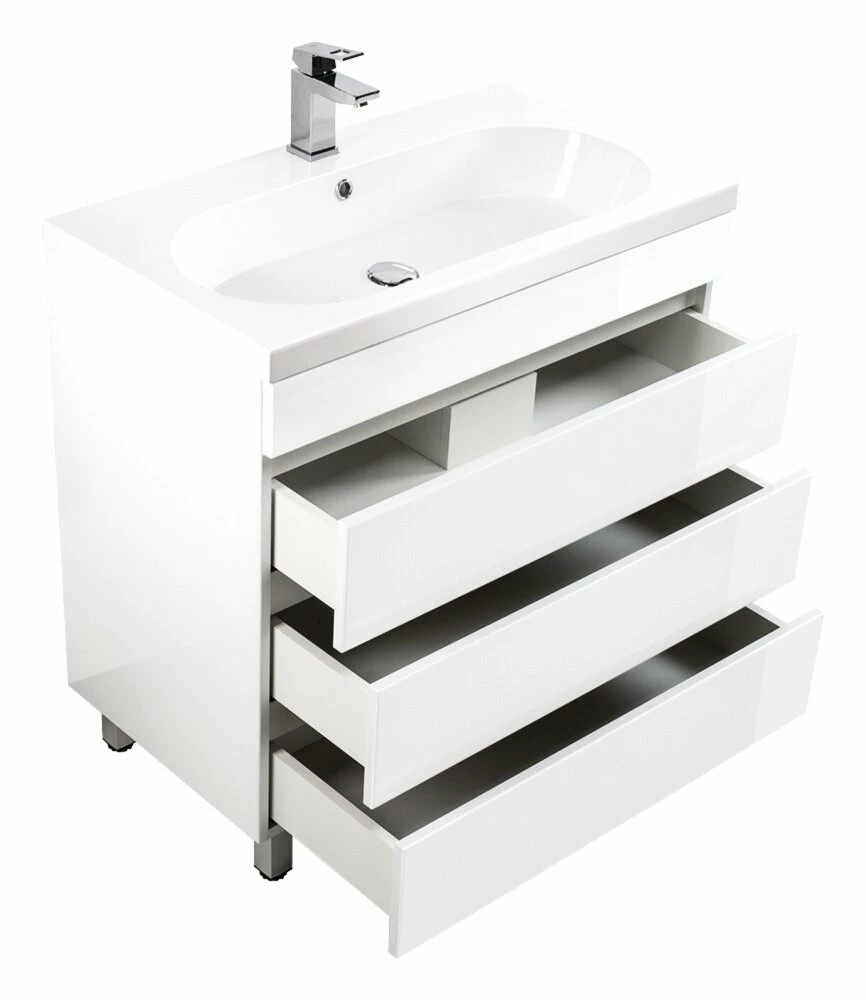 Der Stand-Waschtisch mit Waschbecken steht auf seinen vier Kunststoff-Füßen sehr stabil. Diese können einzeln in der Höhe variiert werden, um Unebenheiten ausgleichen zu können. Drei großzügige Schubkästen mit Softclose stehen Ihnen für Ihre Hygieneartikel zur Verfügung. Die grifflosen Schubkästen sorgen für eine einheitliche und glatte Oberfläche.