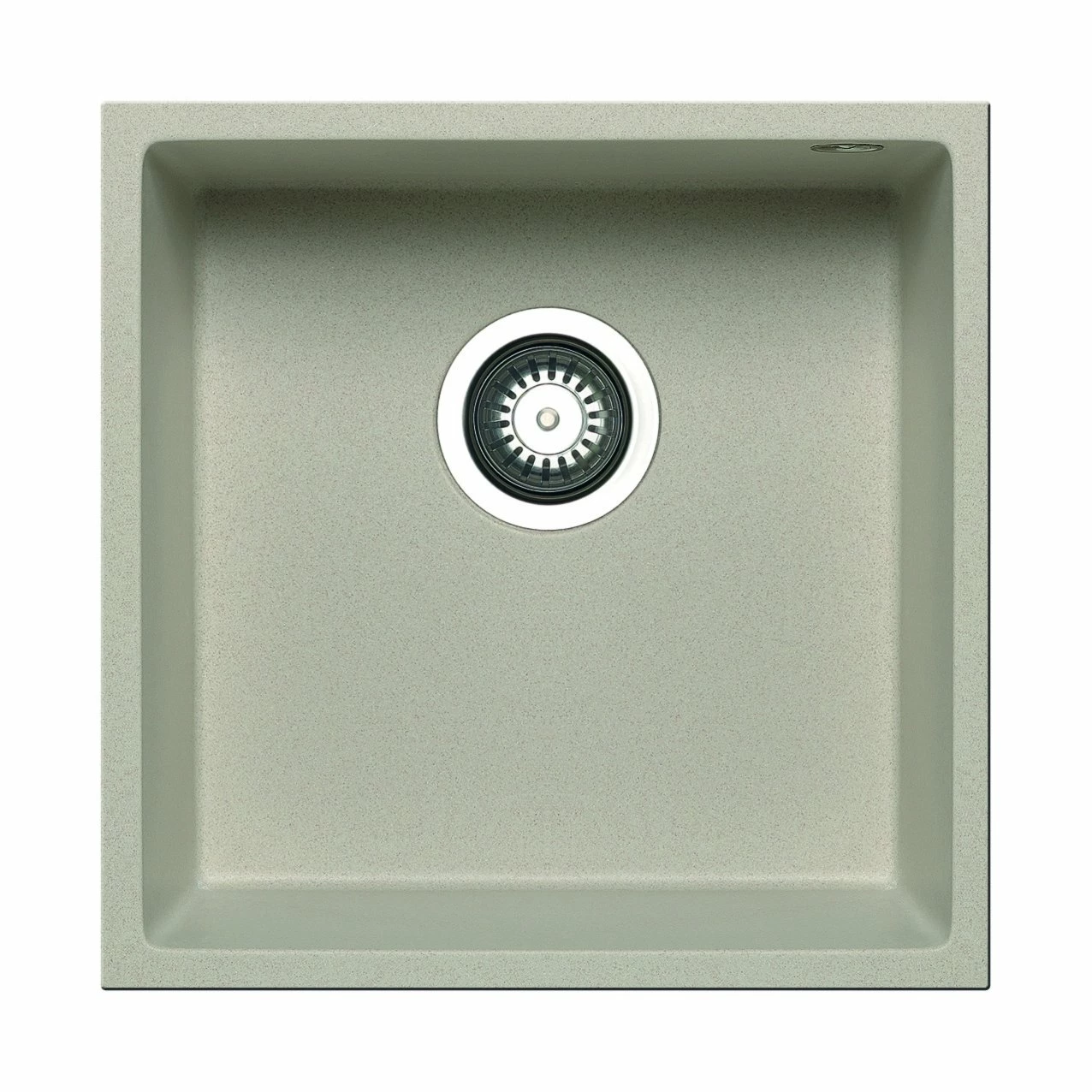 Beigefarbenes Unterbaubecken TETRAGON aus Pyragranite in quadratischer Form. Diese moderne Spüle wird in die Arbeitsplatte „eingelassen“ und ist mit Ab- und Überlaufgarnitur ausgestattet, sowie einem Siebkorb-Ventil.