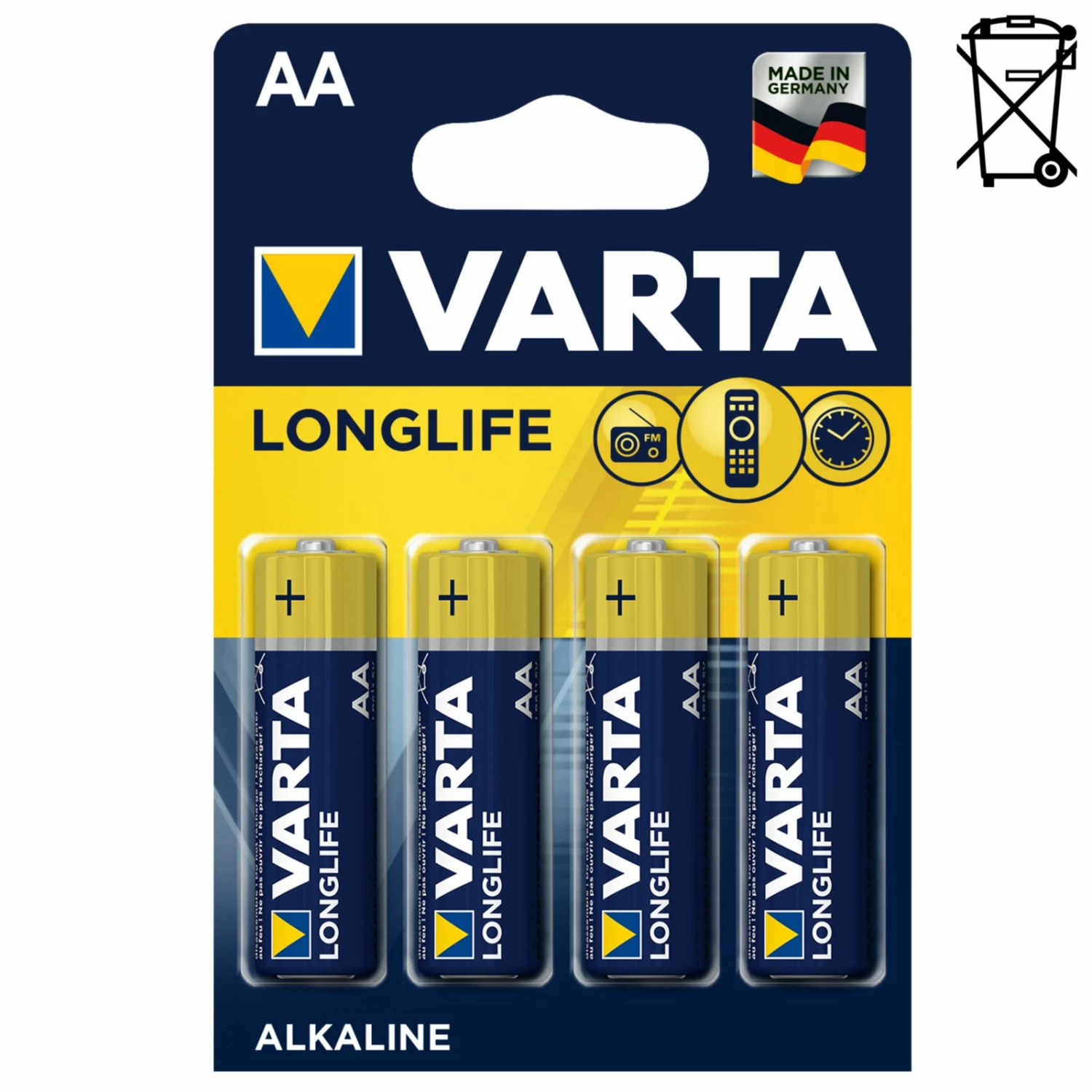 Praktisches 4er-Set LONG LIFE AA VARTA Batterien für Radios, Uhren, Fernbedienungen und viele weitere Elektrogegenstände.