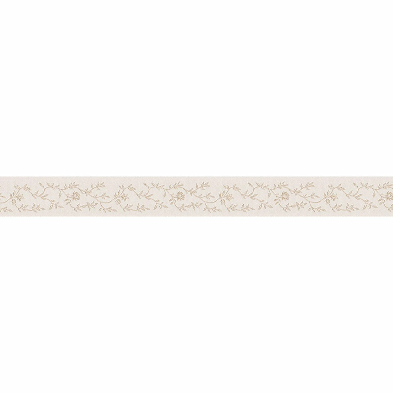 Ausgefallene beigefarbene Vinyl-Borte mit einer Blumenranke. Diese Borte ist selbstklebend, benötigt somit kein Zubehör und ist besonders einfach anzubringen. Sie setzt einen besonders schönen Akzent zum Beispiel auf einer hellen Tapete.