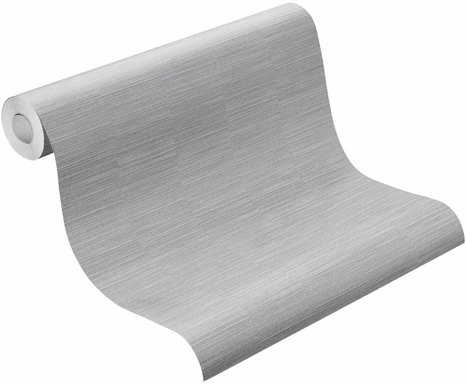Quer macht ganz schön was her, wie diese Vliestapete zeigt. Das Dessin mit den feinen Streifen in mattem und glänzendem Silber gibt dem Auftritt einen edlen Anstrich. Die leicht versetzte Anordnung in Blöcken bringt ein wenig Spiel in die ganze Angelegenheit.