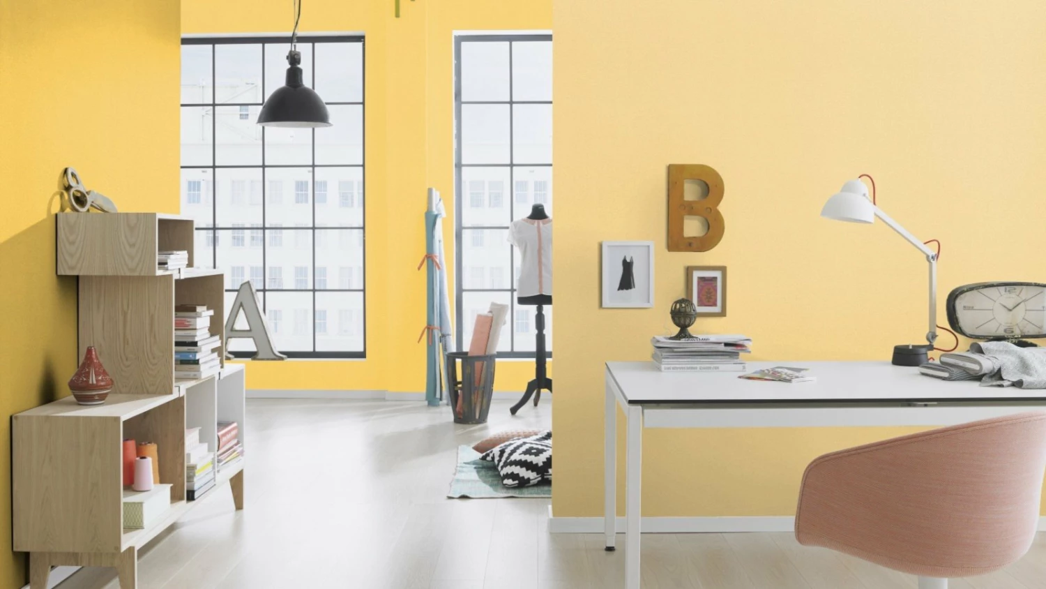 Wow! Dieses strahlende Sonnengelb ist wahrlich ein Hingucker. Der grobkörnige Untergrund erweckt die Knallfarbe zu dreidimensionalem Leben und schenkt der Wand räumliche Tiefe.