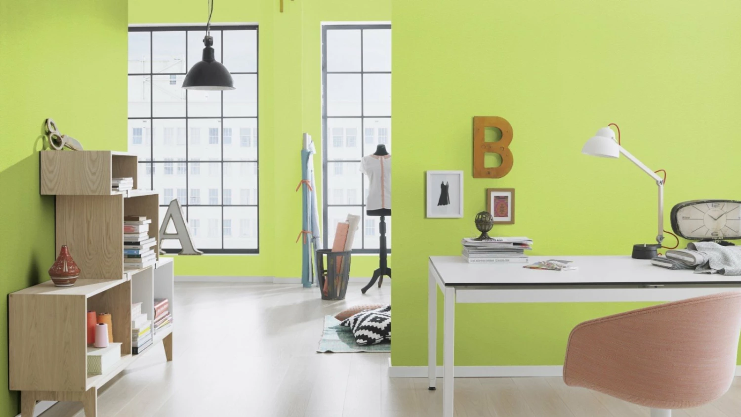 Wow! Diese quietsch-frische Grün ist wahrlich ein Hingucker. Der grobkörnige Untergrund erweckt die Knallfarbe zu dreidimensionalem Leben und schenkt der Wand räumliche Tiefe.