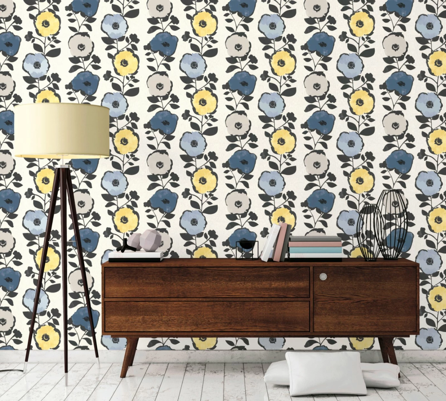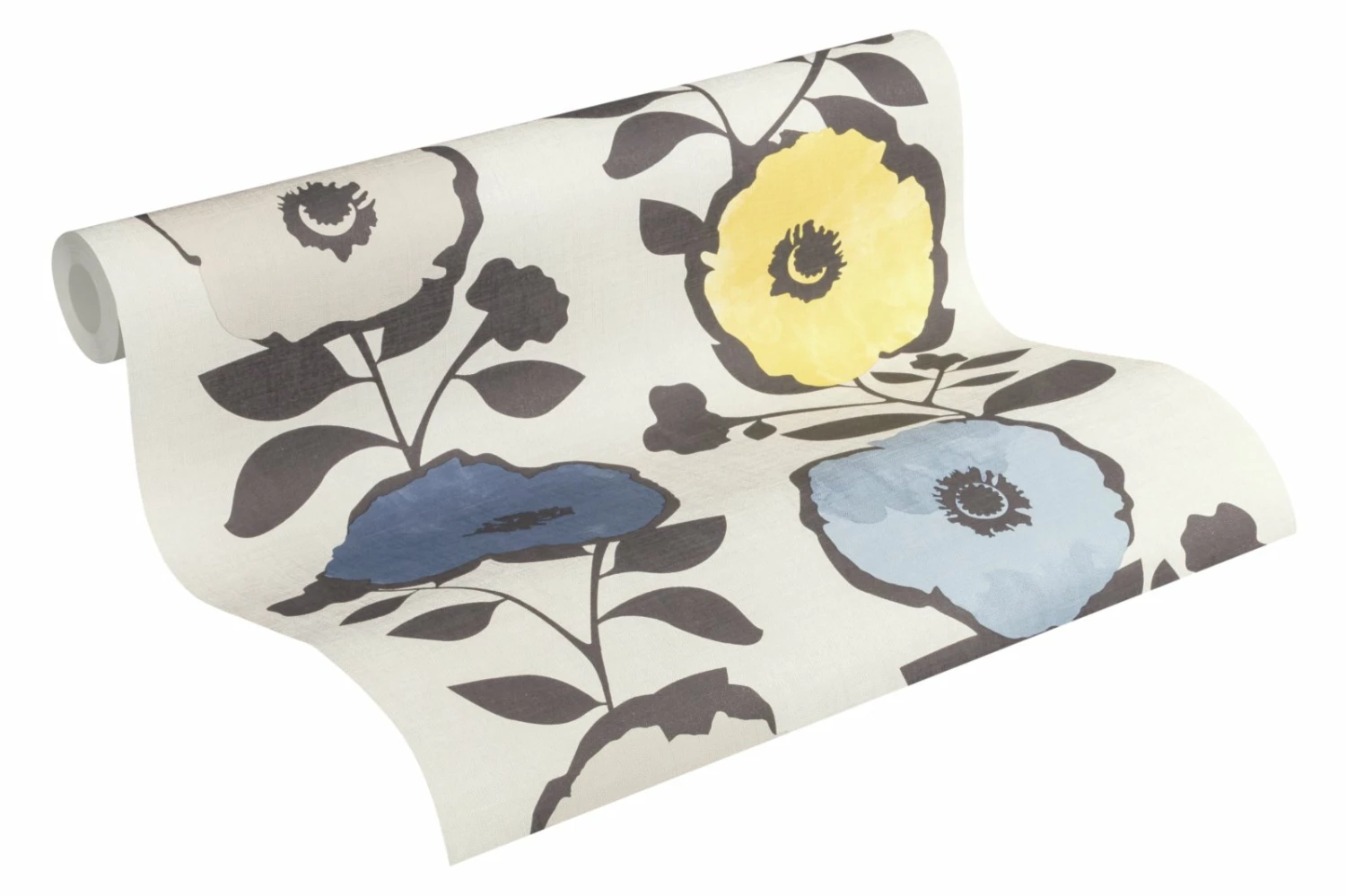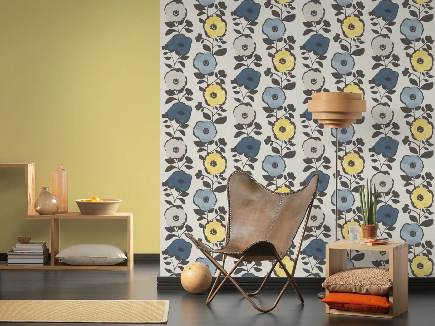 Blumen in Gelb, Blau und Beige zieren diese Tapete der Kollektion SCANDINAVIAN 2. Eine fröhliche Atmosphäre durchquert Ihren Raum und verteilt Frühlingsgefühle. Der Rapport ist gerade, die Tapete ist gut lichtbeständig und außerdem scheuerbeständig.