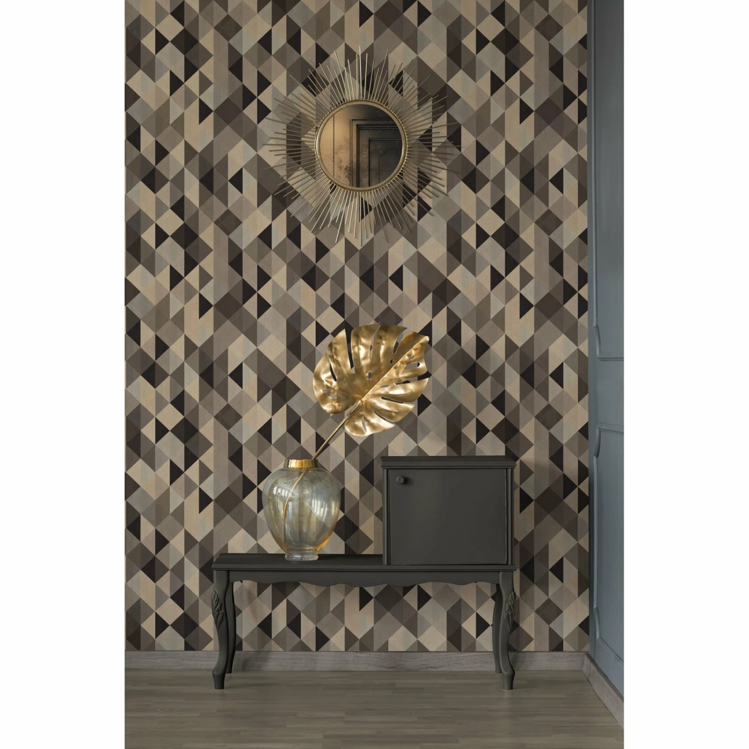 Eine besondere Vliestapete in Schwarz-Braun mit geometrischen Dreiecken wird zum echten Hingucker in Ihrem Zuhause.