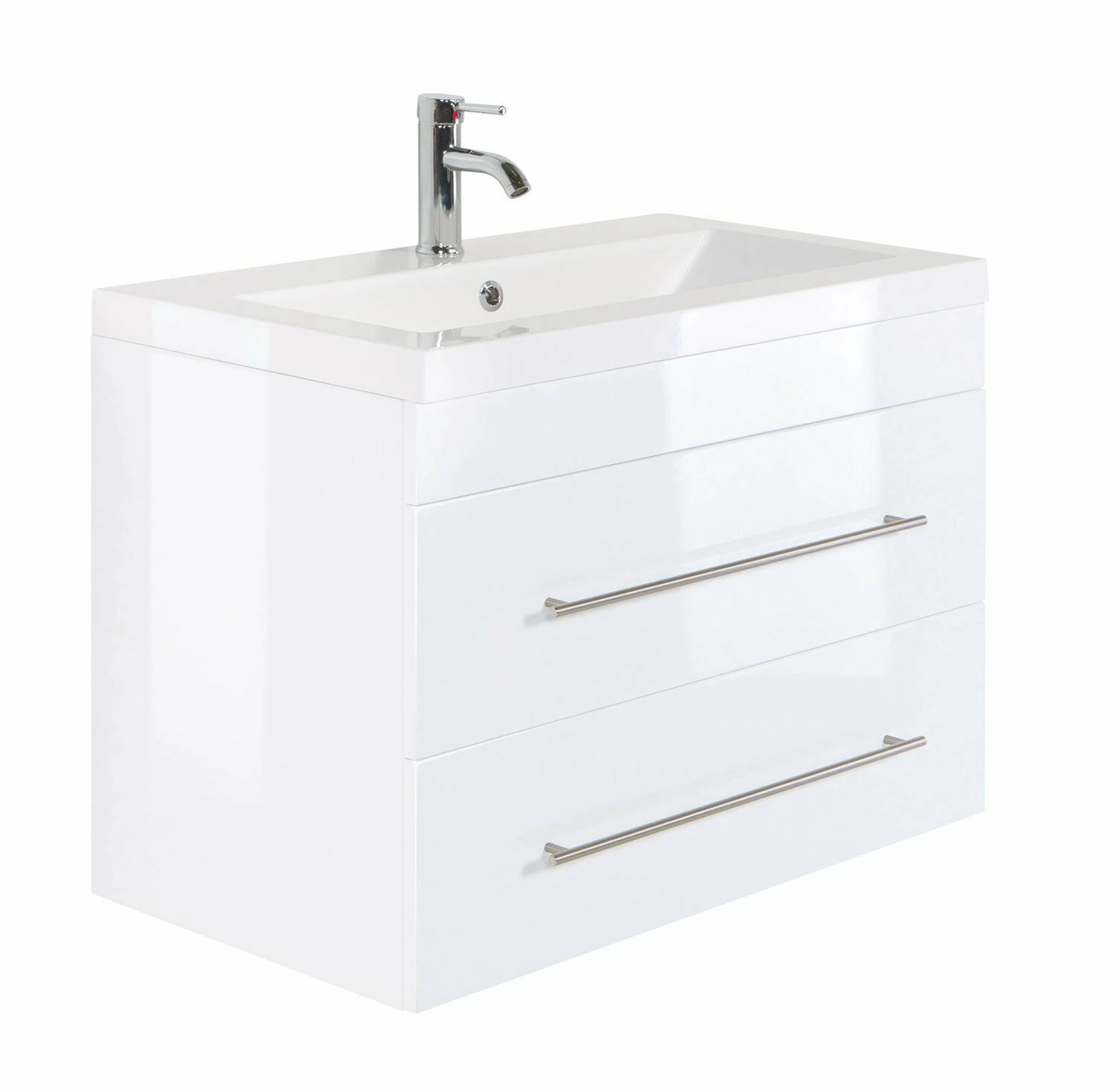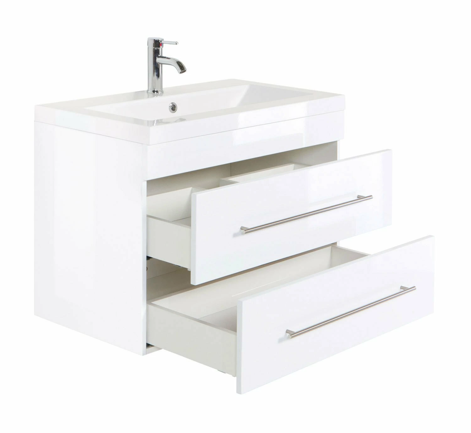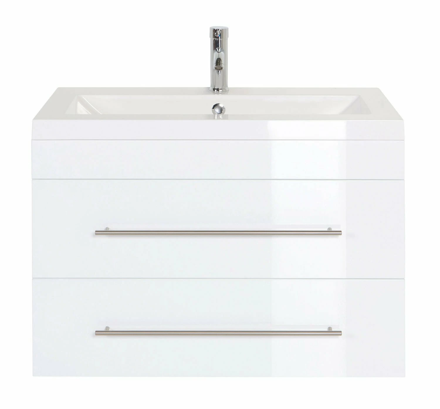 Das schlichte Design dieses Waschtisches AURORA in Weiß Hochglanz ist zeitlos und lässt sich mit jedem Einrichtungsstil super kombinieren. Das zugehörige Waschbecken aus Mineralguss eignet sich herrvorragend für die Verwendung einer Einzelperson. Ausgestattet ist der Waschtisch mit zwei Softclose-Schubladen, welche das Verstauen von den verschiedensten Badutensilien ermöglichen. Die silberfarbenen Griffe bestehen aus Metall und vollenden das schöne Design.