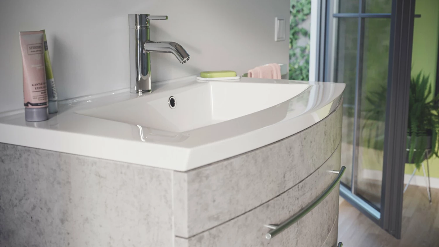 Dieser Waschtisch in Betonoptik ist durch seine abgerundeten Fronten ein echter Hingucker und kann in jedem Badezimmer eingesetzt werden. Die zwei Schubladen bieten eine Menge Platz für sämtliche Badutensilien und sind mit Softclose für ein leises Schließen ausgestattet. Im Lieferumfang ingebriffen ist bereits ein schönes Waschbecken aus Mineralguss.