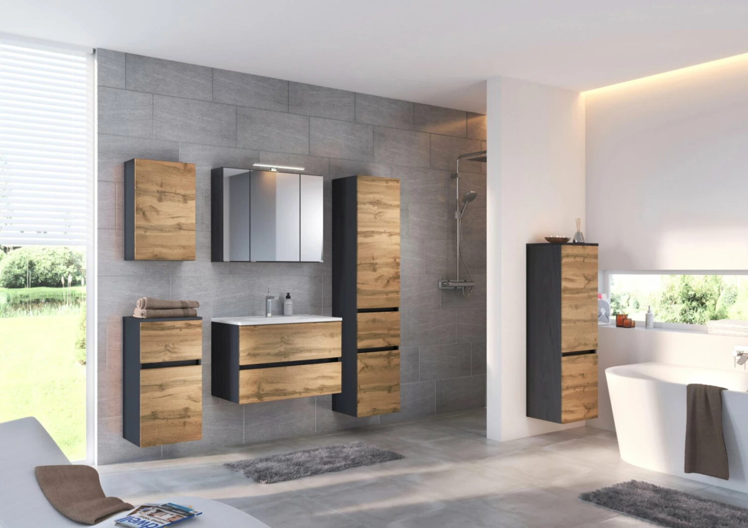 Trendiger grafitgrauer Waschtisch LUCCA mit Fronten in Wotan Eiche Nachbildung. Der Schrank verfügt über zwei Auszüge worin Sie Badutensilien aufbewahren können. Zudem besitzt er eine Softclose-Funktion für ein leises Schließen der Auszüge. Das Design ist vielseitig kombinierbar.